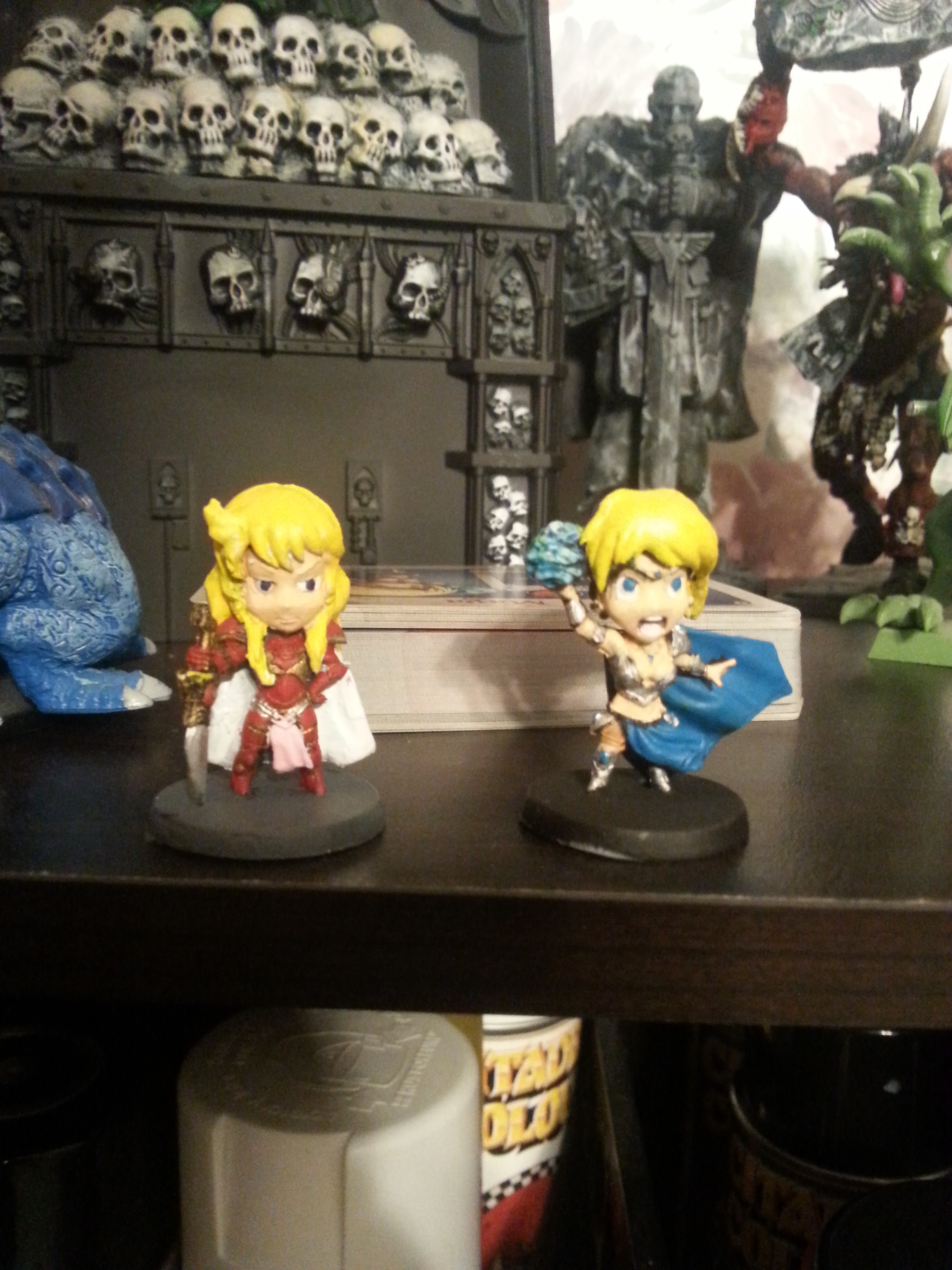 I may do some more work on both (and I’m not the best painter in the world), but here is Diva (the woman in red armor) and Maya (a yoga-practicing sorceress). Maya definitely needs some finishing, however I was surprised at how fun it was to do the faces and the eyes, which normally are a pain for my smaller headed figures.